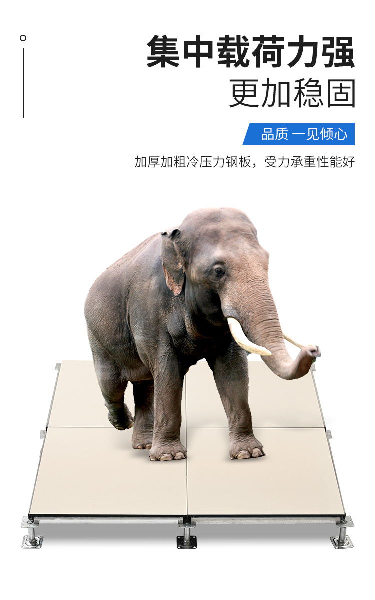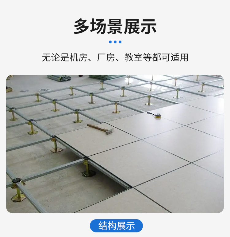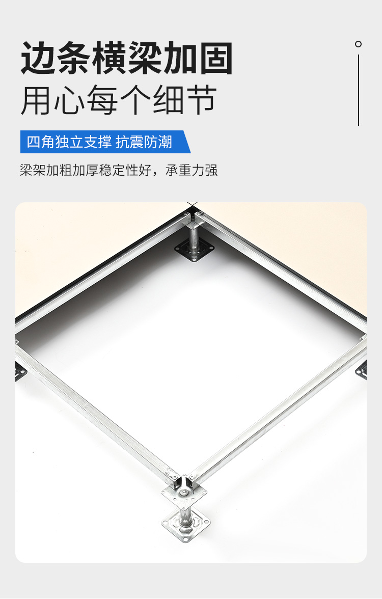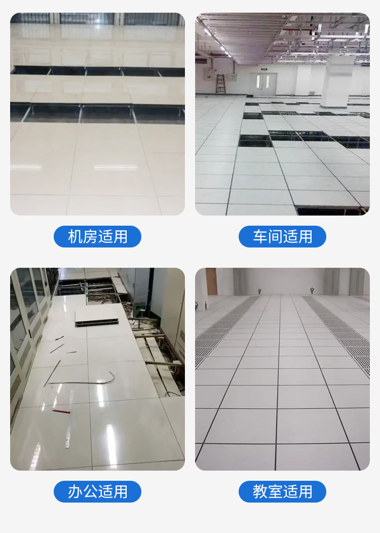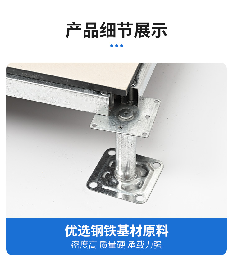 - 结构适配:模块化设计支持600×600mm、610×610mm等多规格选择,支架高度25-60cm可调,均匀载荷≥2.5kN/㎡,集中载荷最高达1000kg/㎡,重型设备车间与普通机房均能适配。