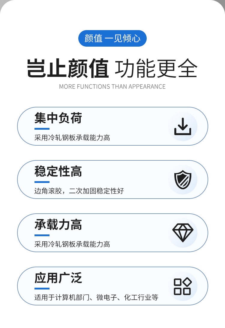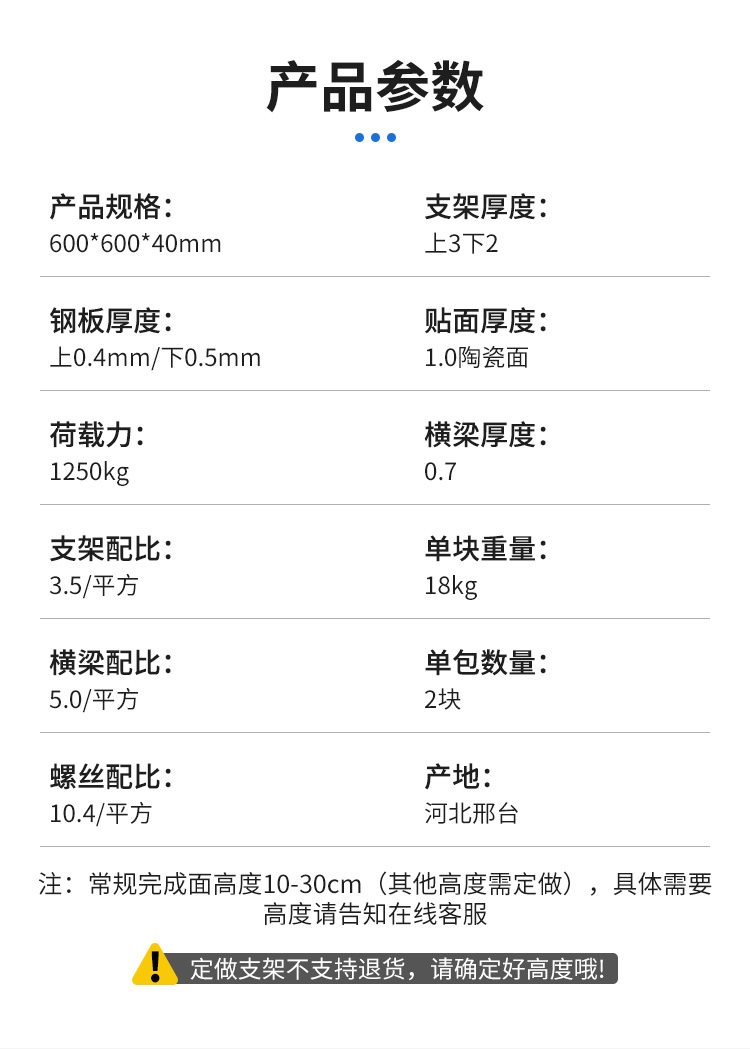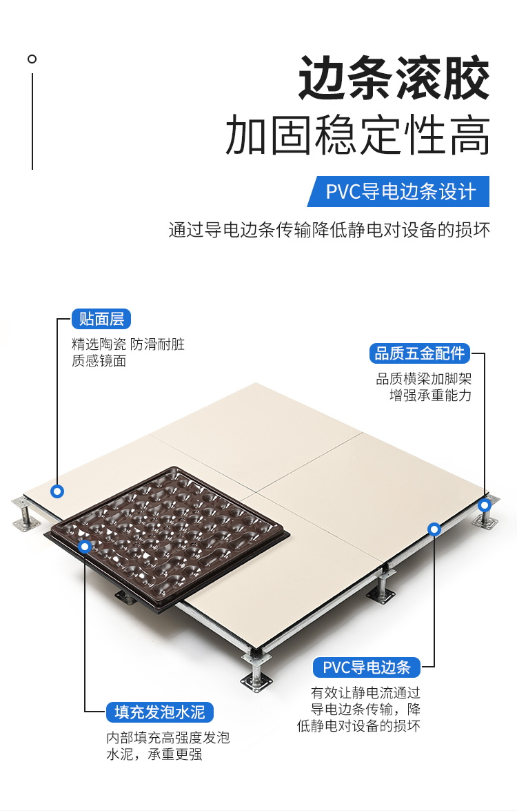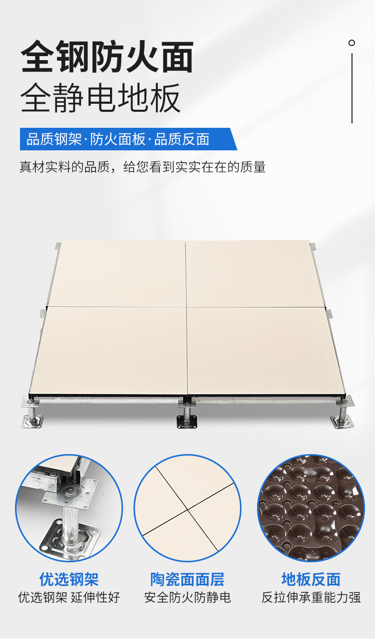 - 结构适配:模块化设计支持600×600mm、610×610mm等多规格选择,支架高度25-60cm可调,均匀载荷≥2.5kN/㎡,集中载荷最高达1000kg/㎡,重型设备车间与普通机房均能适配。